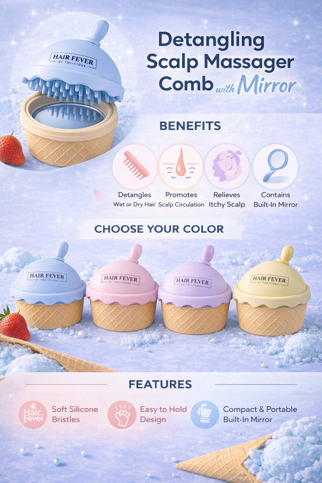 The Hair Fever Scalp Massager Brush by Tolicious is a fun, ice-cream–inspired scalp brush designed to gently cleanse, massage, and stimulate the scalp for healthier-looking hair.